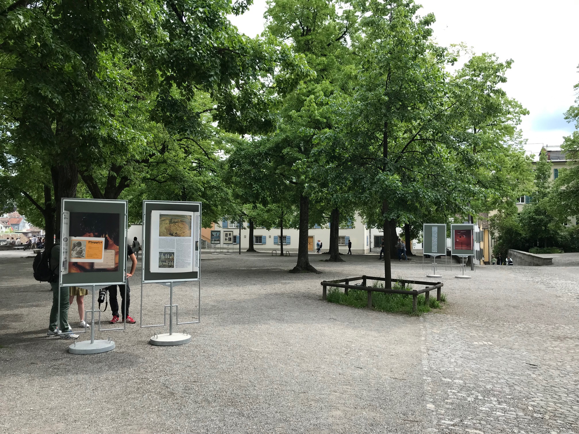 Zwölf Plakatständer mit Betonfuss sind paarweise zwischen den Bäumen auf dem Lindenhof angeordnet und zeigen beidseitig aufgezogene Motive aus der Serie Repro (seit 2018) von Matthias Gabi. Die Presseerzeugnissen, Lexika, Kunstkatalogen oder Produktebroschüren entnommenen Vorlagen sind Bild-Text-Kombinationen, die der Künstler fotografisch reproduziert hat. Für die Gasträume 2019 hat er Repro um neue Sujets erweitert. Die wechselvolle Geschichte des schattigen Lindenhofs geht bis zu den Kelten zurück. Heute ist die älteste öffentliche Grünanlage von Zürich bei Touristen als Aussichtspunkt ebenso beliebt wie bei den Bewohner_innen der Stadt, die sich zum Pétanque- und Schachspielen treffen oder kurz verweilen. Im Gegensatz zur Präsentation im Ausstellungsraum sind die Bilder aus Repro hier frei und lose zwischen den zahlreichen Linden platziert. Mit den Plakatständern sind sie auf einem Trägermedium angebracht, das eigentlich einem kommerziellen Zweck dient und hier die vertikale Struktur der über 50 Bäume formal aufnimmt. Die paarweise Anordnung ist an das Prinzip der Doppelprojektion angelehnt, die vom Kunsthistoriker Heinrich Wölfflin (1864–1945) ausgehend die Praxis der Wissensvermittlung in der Kunstgeschichte bis heute prägt. Auf dem Lindenhof interagieren die Sujets mit neuen und alten Nachbarn. Auf formaler und inhaltlicher Ebene lassen sich Kontraste, Verbindungen oder Entsprechungen ausmachen, denen ein Potential für neue Narrative innewohnt. Die Motive als statische Kondensate laden die Besucher_innen des Lindenhof zu einem zweiten Blick ein, aber auch dazu, durch diesen «Bilderwald» hindurch zu wandeln und sich auf visuelle Um- und Abwege einzulassen. Durch den Transfer von reproduzierten Gebrauchsfotografien über Archivfotografie auf Plakate im öffentlichen Raum wird der Zweck, Absender und ursprüngliche Kontext der Motive uneindeutig. Repro ist eine Setzung, die subtile Irritation schafft.