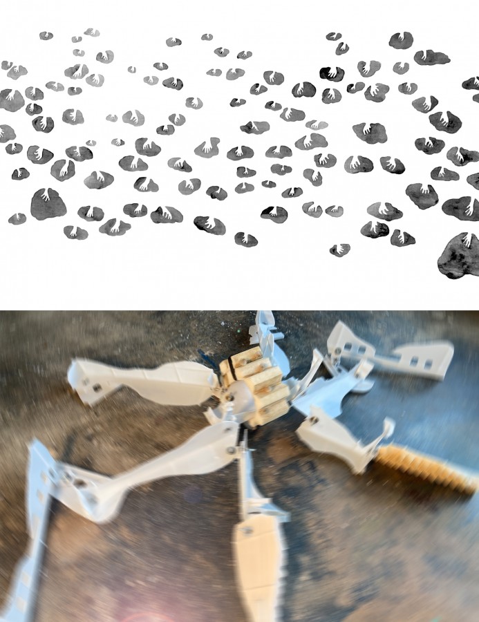 "work smarter" is a work that Corina Rauer originally developed during a stay at the Fundaziun Nairs and consists of drawings and text. Further drawings have since been created. For the Frisch exhibition, she is accompanied by Martin Heynen, who reverberates the voices of the deep.