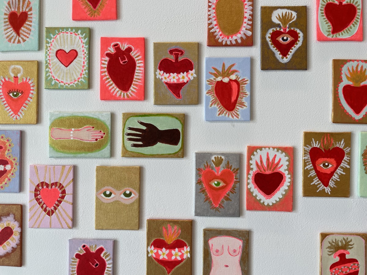 Meine Arbeit überträgt diese Bildsprache in die Gegenwart und setzt sie für den Wunsch nach Menschlichkeit und gegenseitigem Respekt ein. Die Wandinstallation zeigt vielfältige Darstellungen von Herzen, Sinnesorganen und Körperteilen, als Ausdruck von Sehnsucht und Dankbarkeit für jede Form von menschlicher Würde.