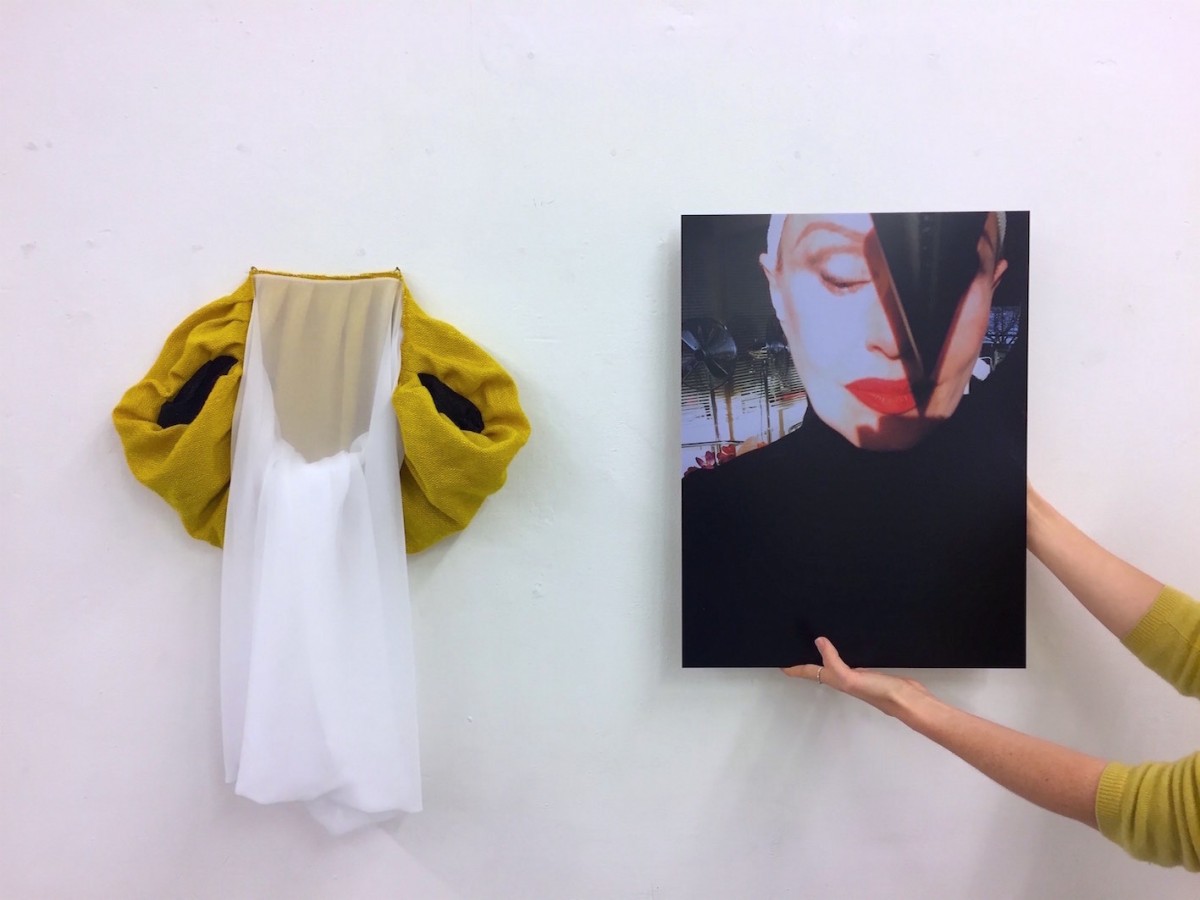 Abb. (v.l.n.r.): Ida Dober, Futteral 7, 2016, Textilien und Faden, 42 x 52 x 10 cm und MANON, LOT, 2016, Fotografie auf Aluminium, 50 x 37 cm.