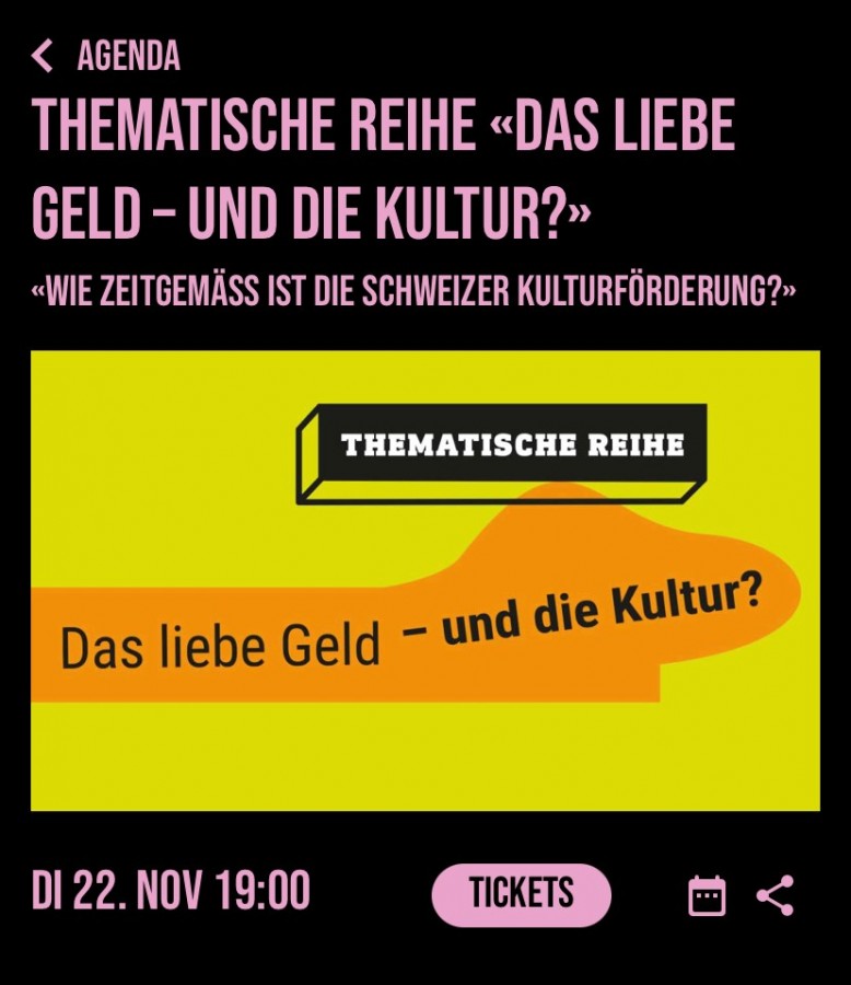 Schon mal überlegt, wie sich Kultur finanziert und wovon Kulturschaffende eigentlich leben? An der zweiten Veranstaltung der thematischen Reihe «Das liebe Geld – und die Kultur?» wird das hiesige Kulturförderungssystem genauer unter die Lupe genommen. Klick hier für mehr Infos.